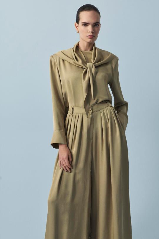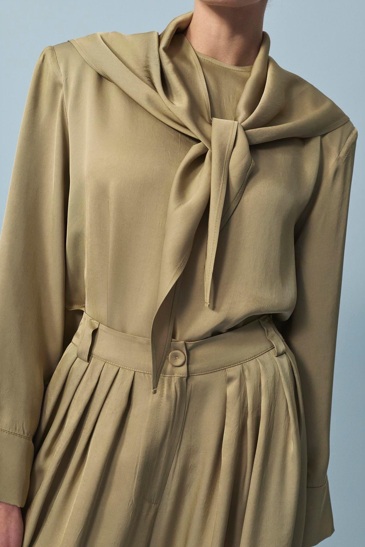 Evan Asetat Fularlı Bluz Pantolonlu Takım Yeşil