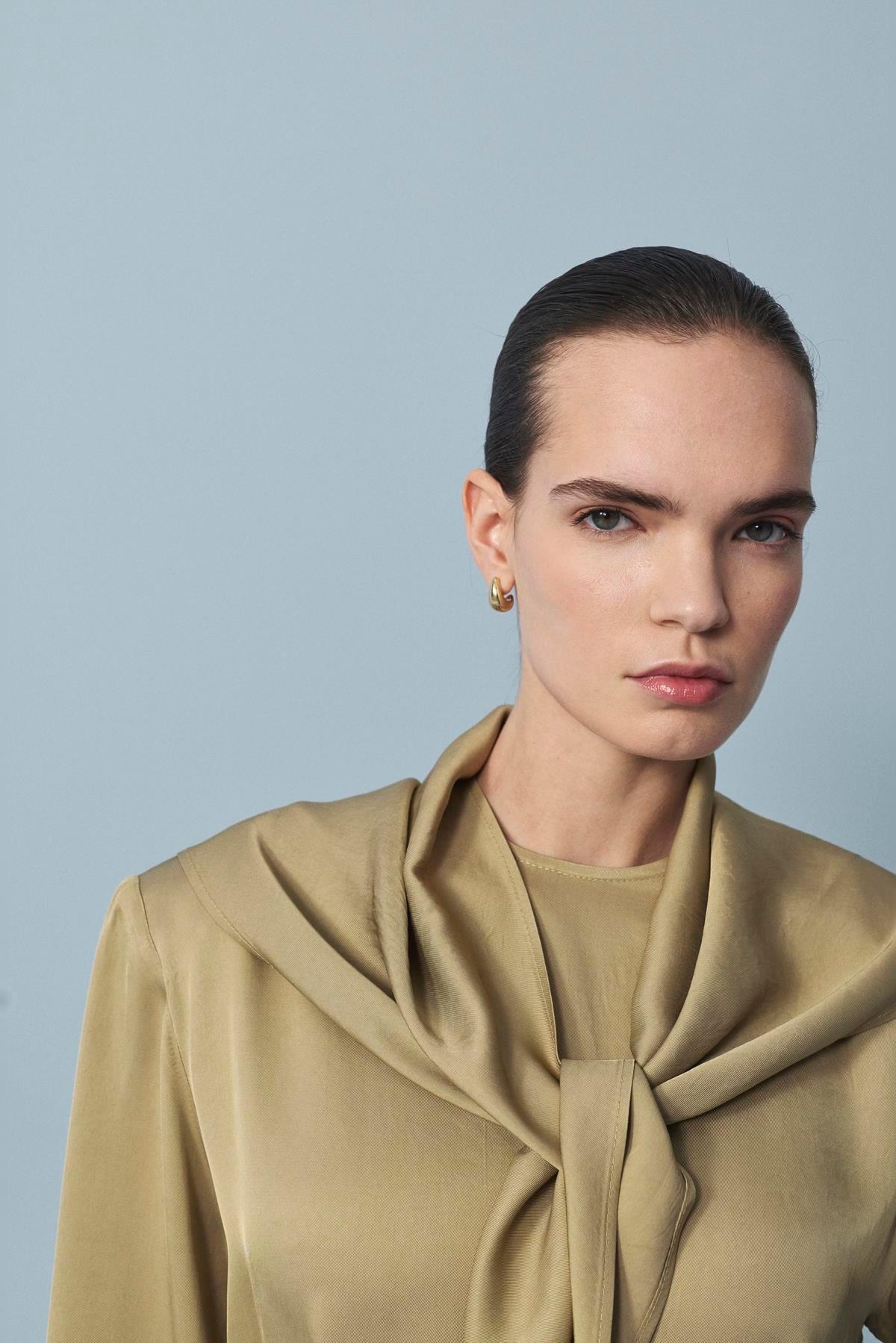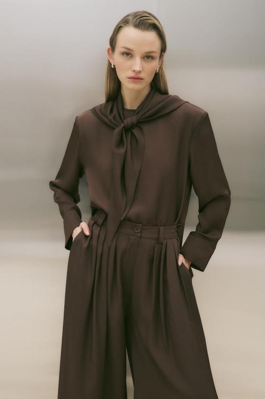 Evan Asetat Fularlı Bluz Pantolonlu Takım Kahve