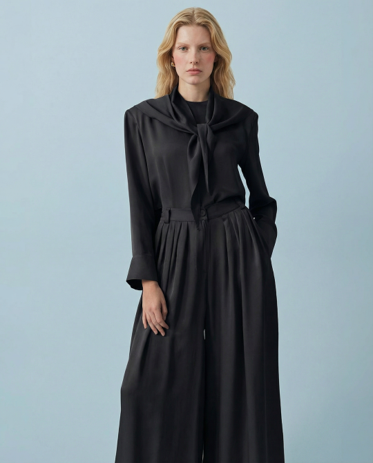 Evan Asetat Fularlı Bluz Pantolonlu Takım Siyah